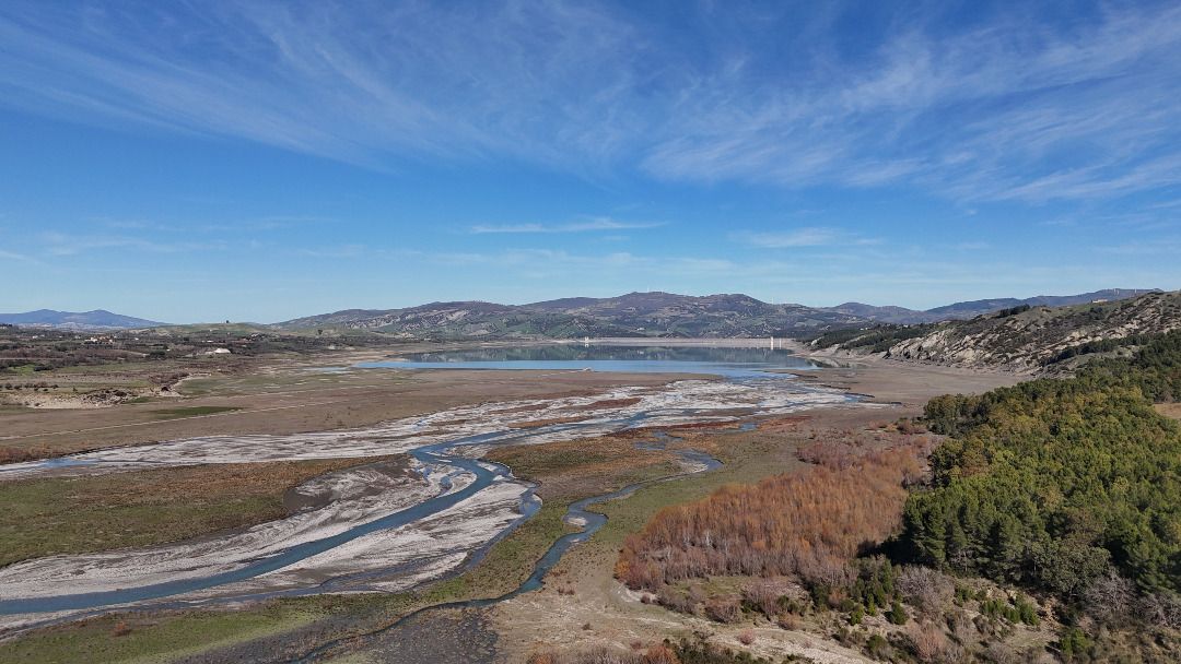 La diga di Monte Cotugno, che ne fa da cornice, è la più grande diga d'Europa in terra battuta. Il muro misura in 1850 m di lunghezza e 60 m d’altezza.